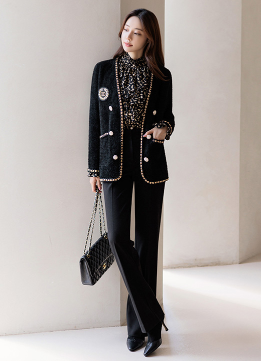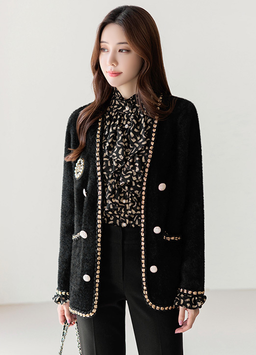 볼드한 쥬얼리 버튼으로 화사함을 더해주고