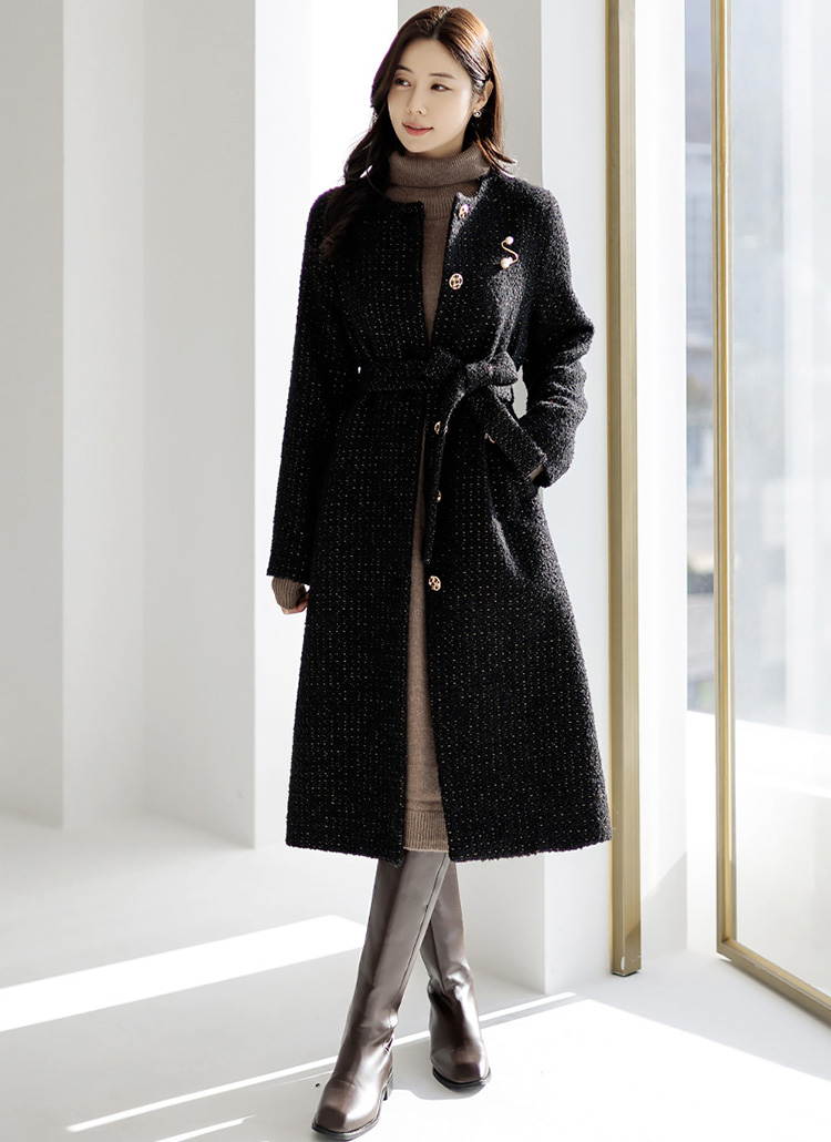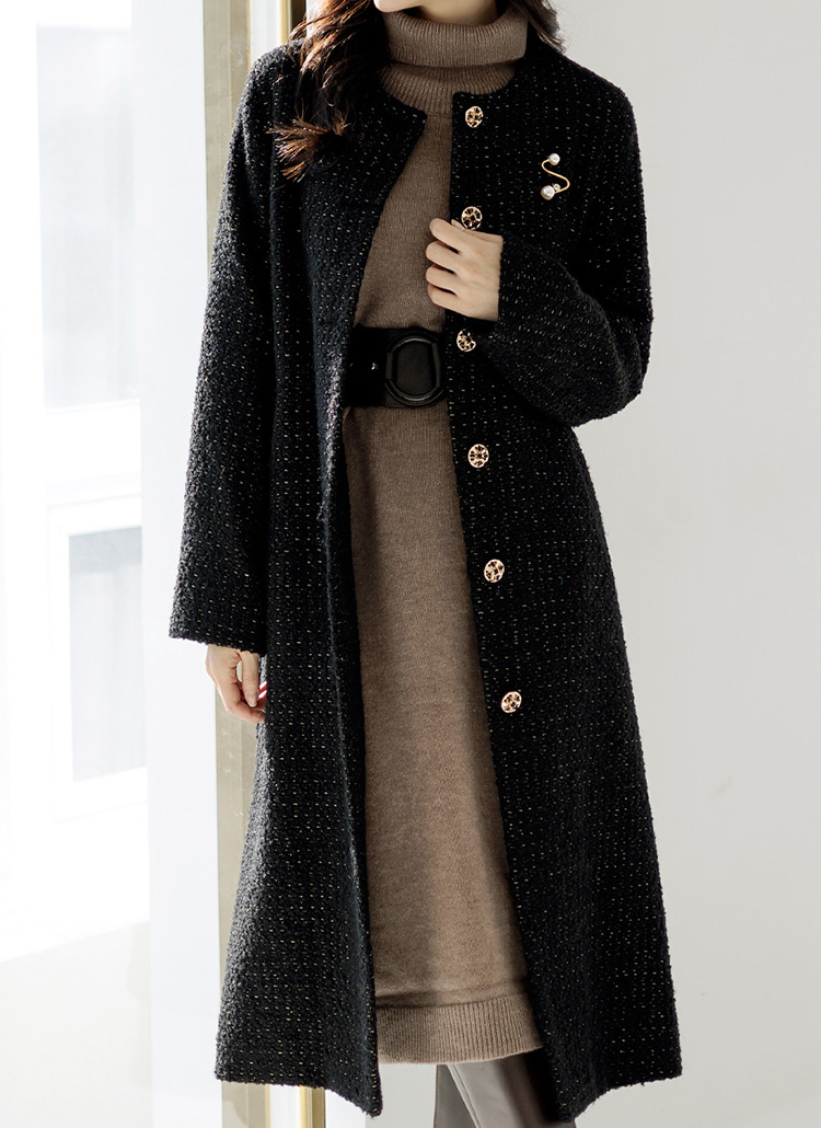 [LouisAngel] Wool Blend Collarless Self Belted Gold Metallic Tweed Coat w/ Brooch