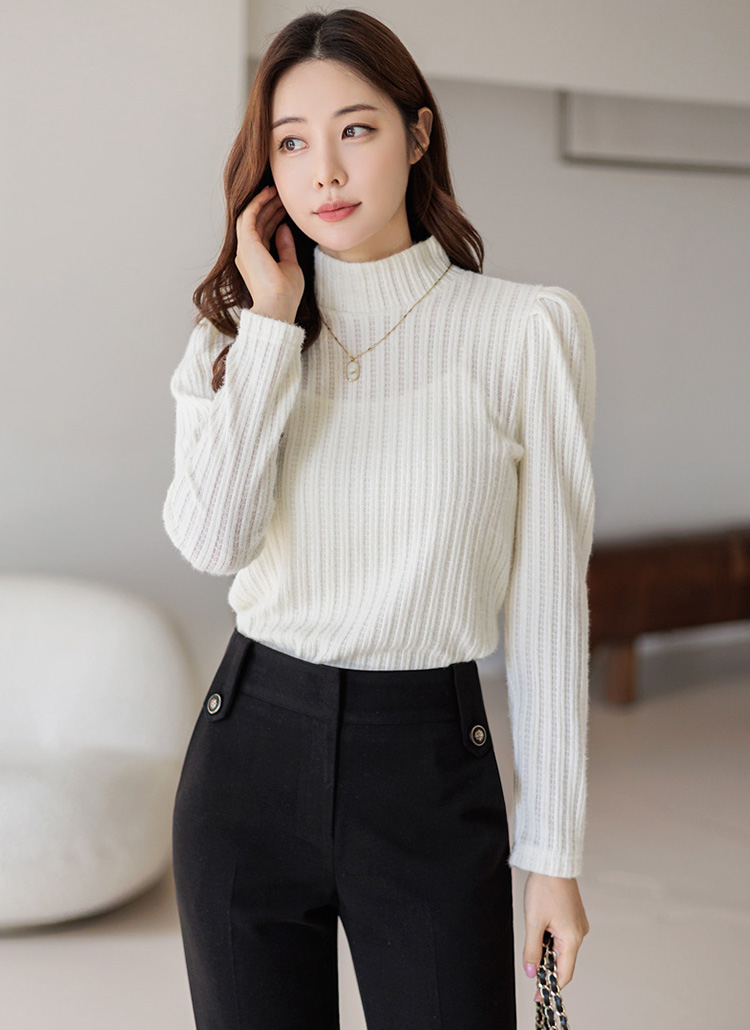 [LouisAngel] Mock Neck Puff Sleeve Fuzzy Ribbed Top