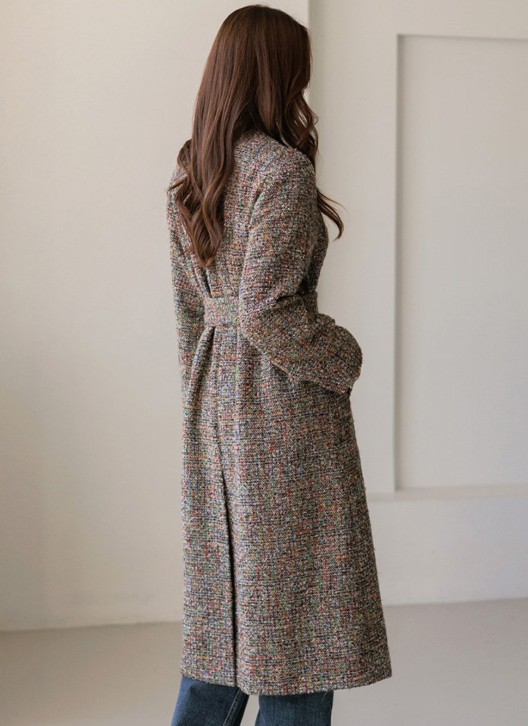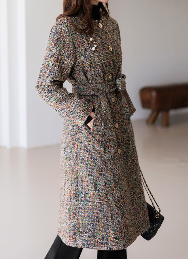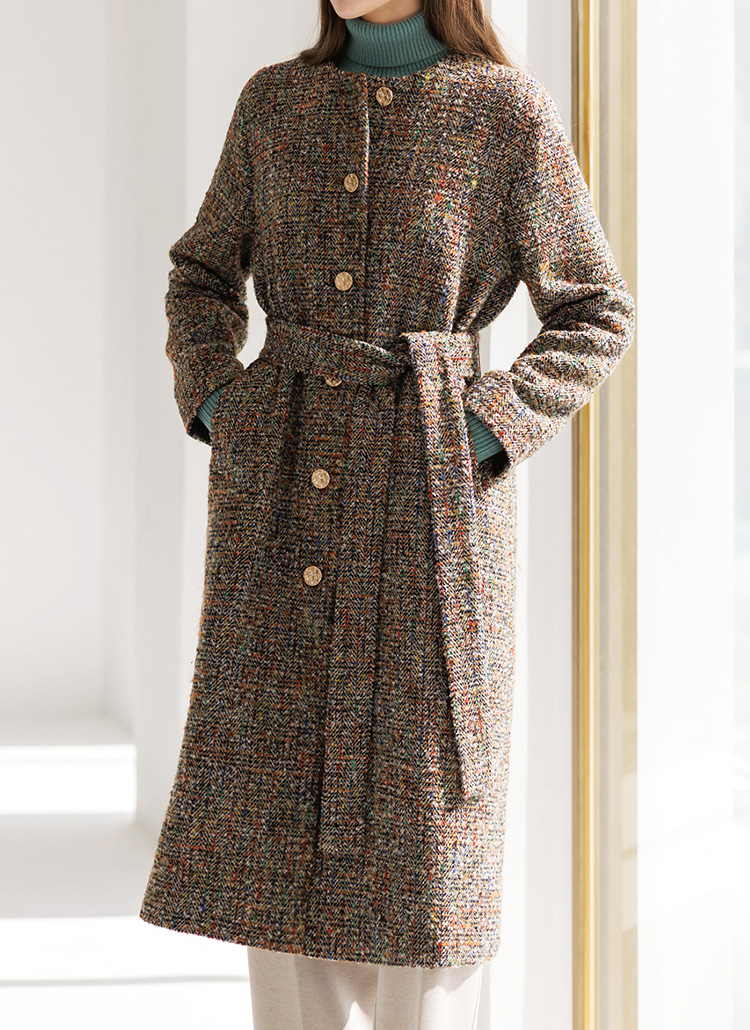 [LouisAngel] Wool40 Collarless Self Belted Herringbone Long Coat w/ Brooch