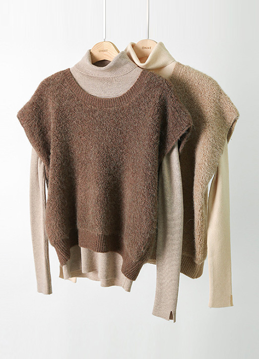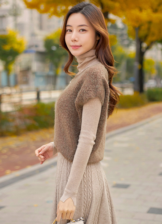 [SET] Slit Sleeve Turtleneck Knit Top & Fuzzy Knit Vest