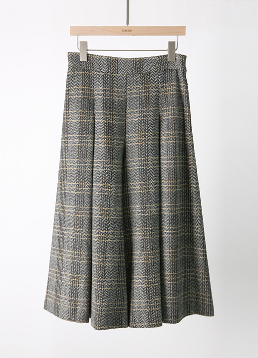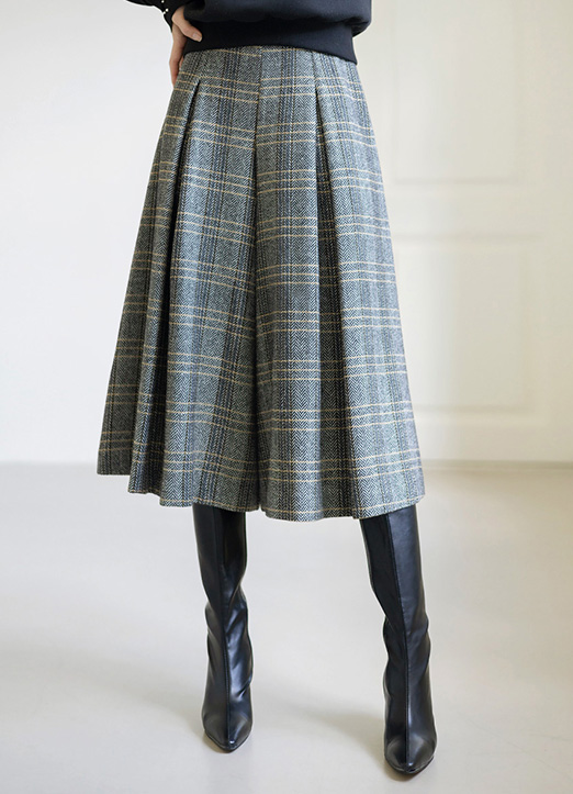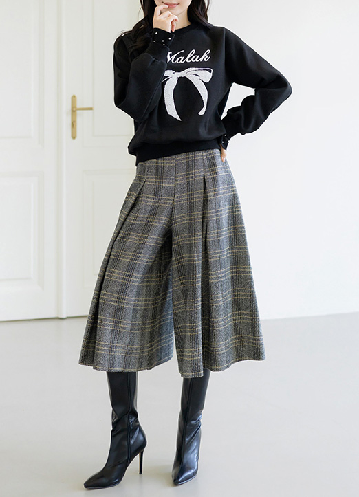 [LouisAngel] Elastic Back Waist Inverted Pleats Check Wide Leg Skorts