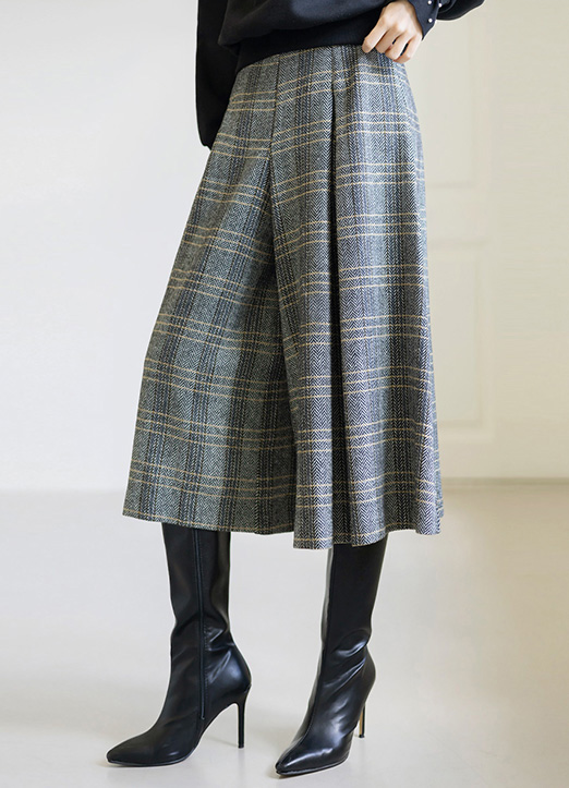 [LouisAngel] Elastic Back Waist Inverted Pleats Check Wide Leg Skorts