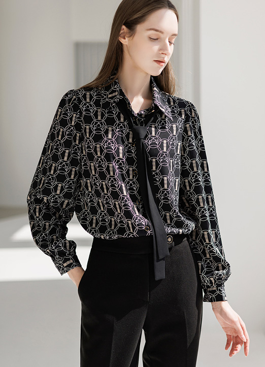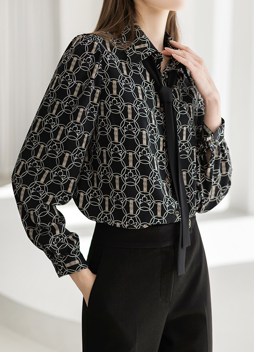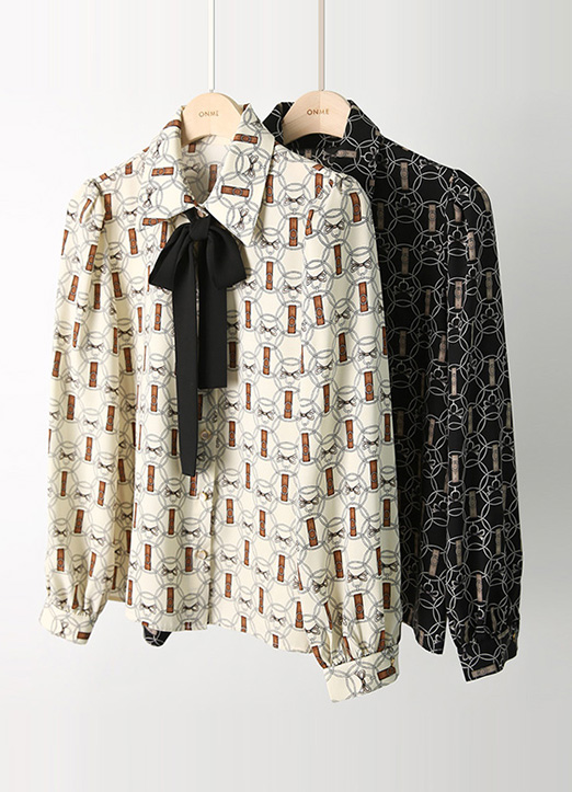 [LouisAngel] Chain & Strap Print Blouse w/ Detachable Black Tie