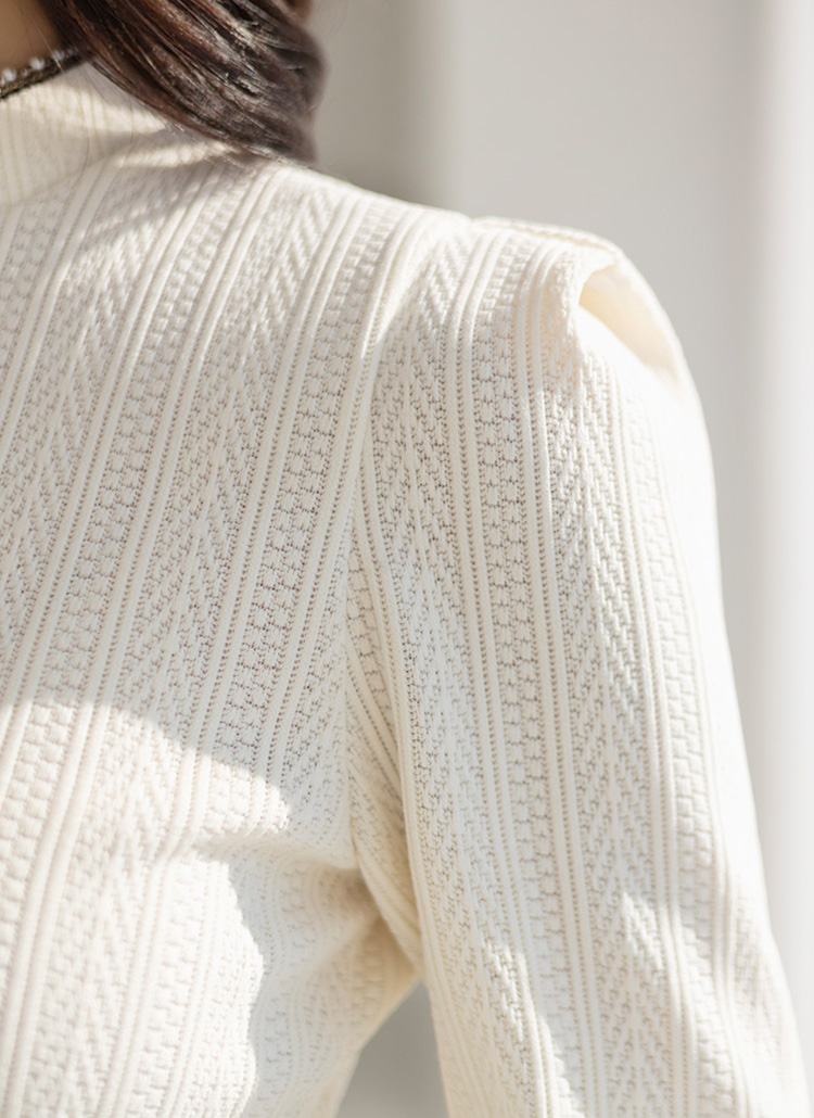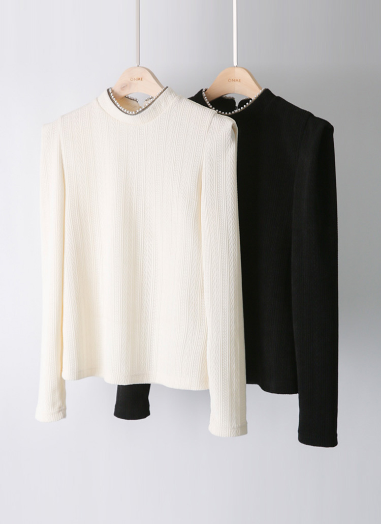 [LouisAngel] Pearl Trimmed Mock Neck Puff Sleeve Textured Top