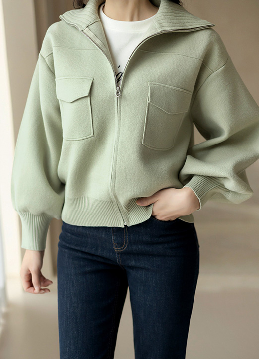 (6 Colors) Ribbed Zip High Neck Voluminous Sleeve Knit Cardigan
