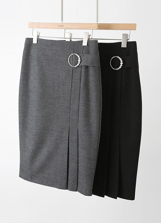 Pearl Embellished Ring Detail Side Pleats H-Line Skirt