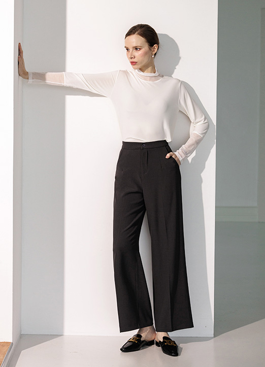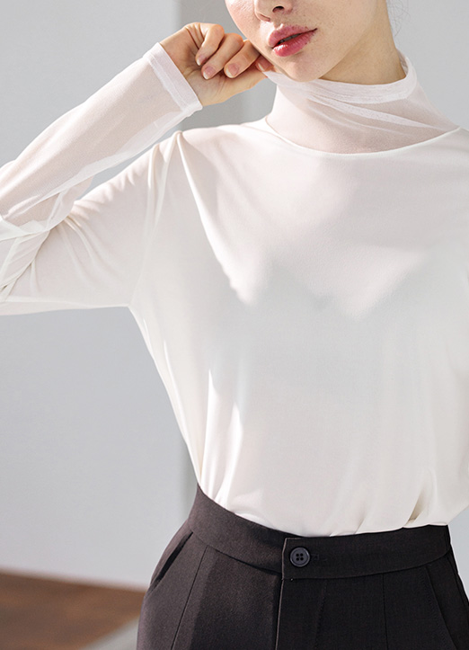 [Silky soft polyester blend top with subtle mesh contrast at collar and cuffs, offering flattering fit and polished everyday elegance.]