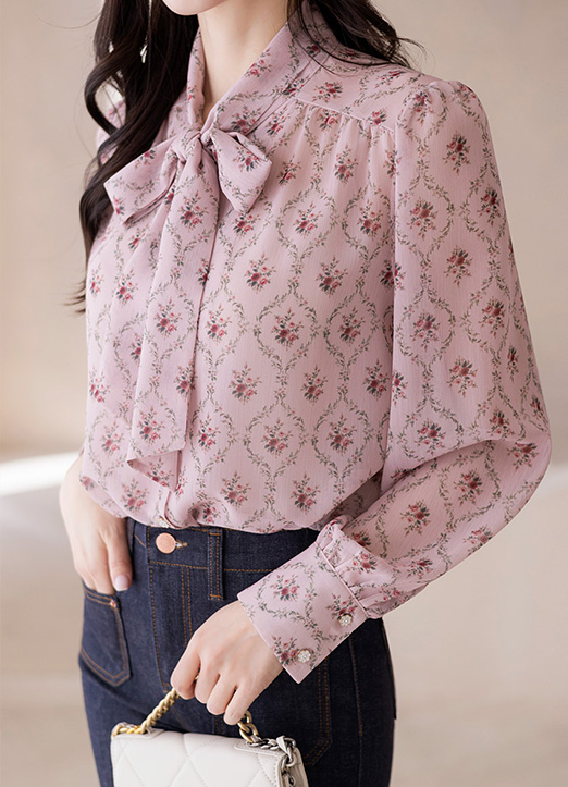 [LouisAngel] Tie Neck Floral Shirring Chiffon Blouse