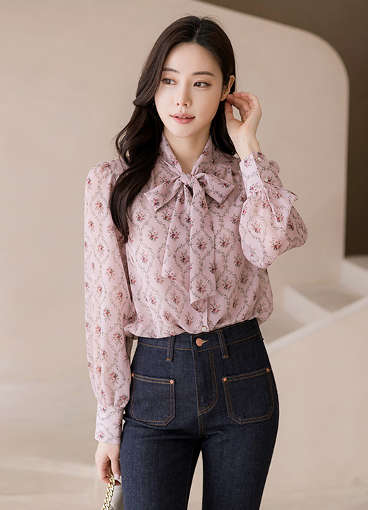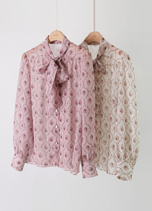 [A silky chiffon blouse with an antique floral pattern, featuring a tie-neck detail for versatile styling.]