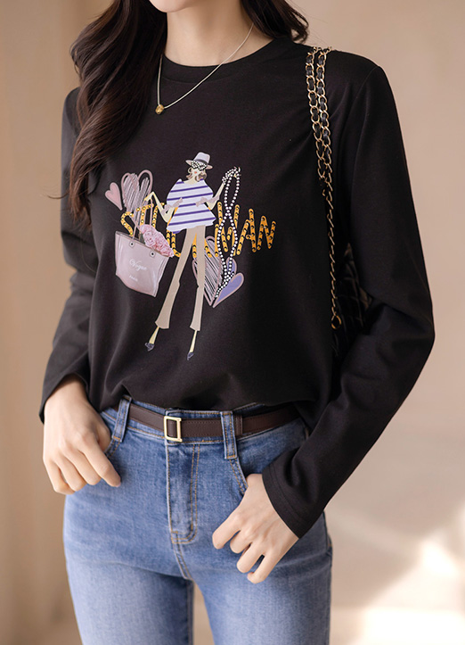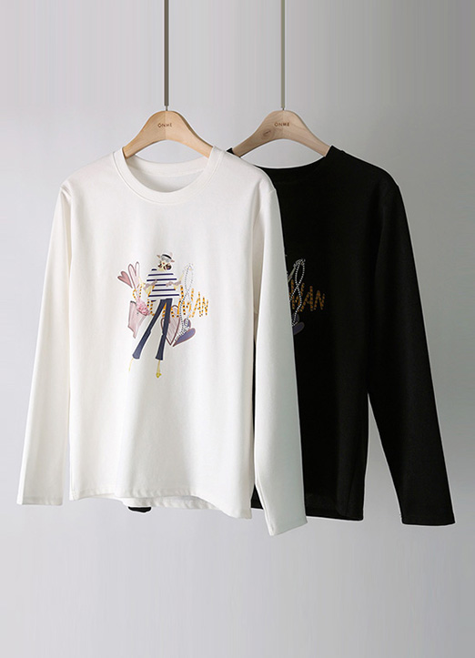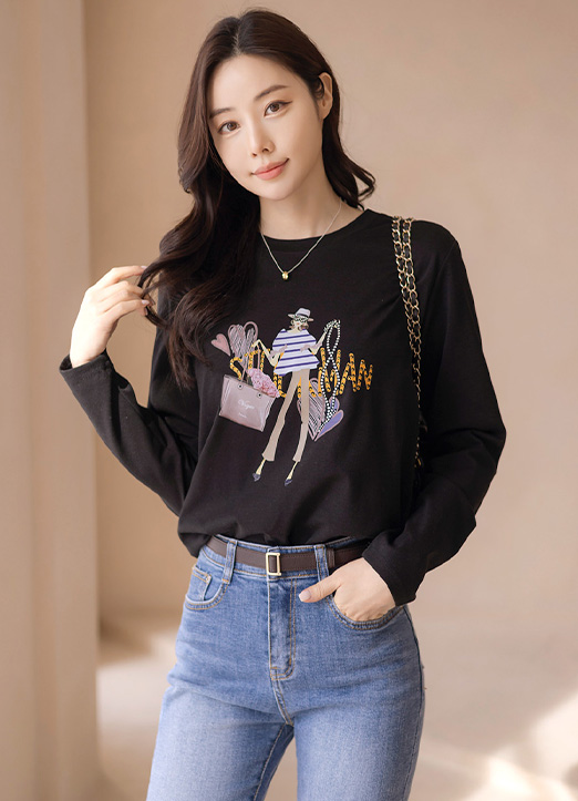 [ A casual yet eye-catching tee with a dazzling print of a stylish woman, accented with beads and charming heart details.]