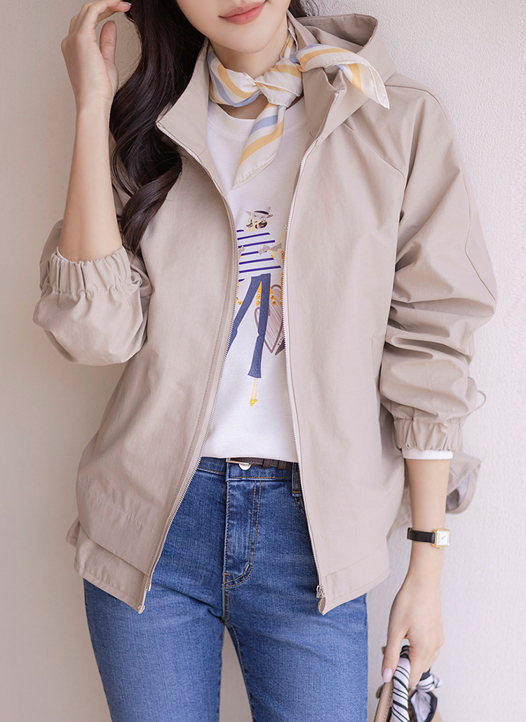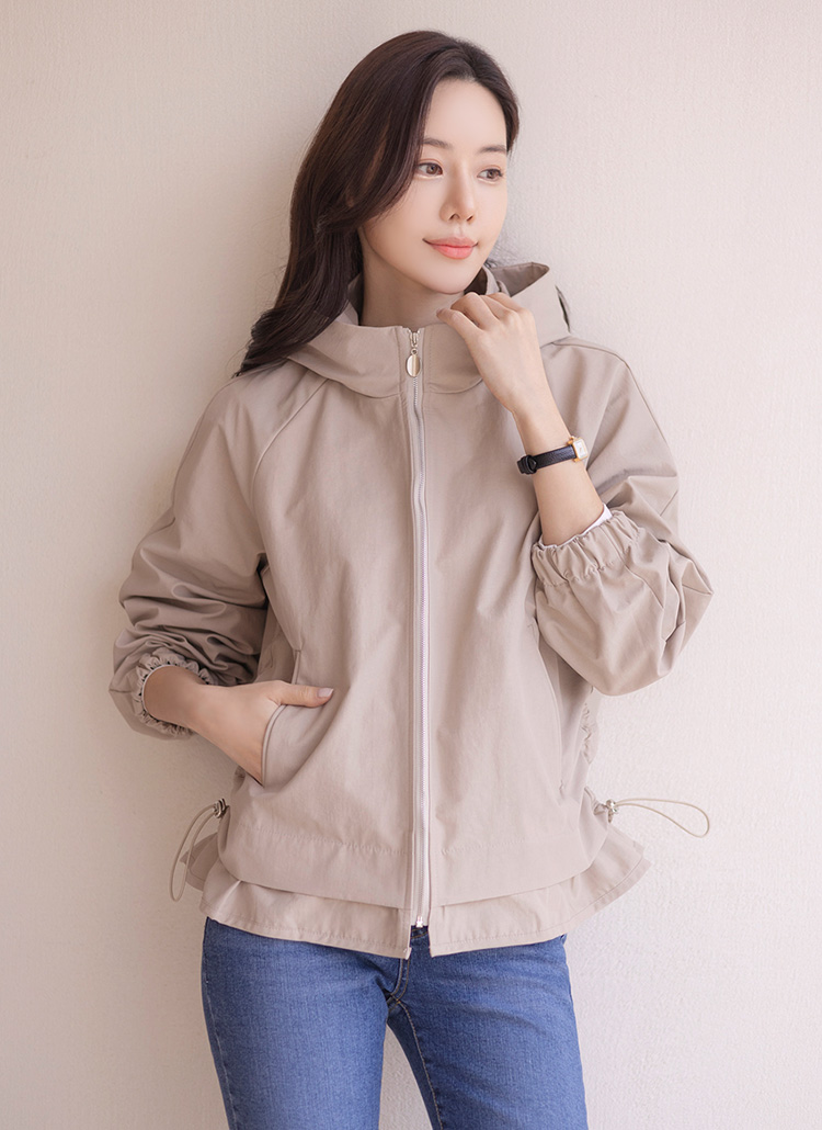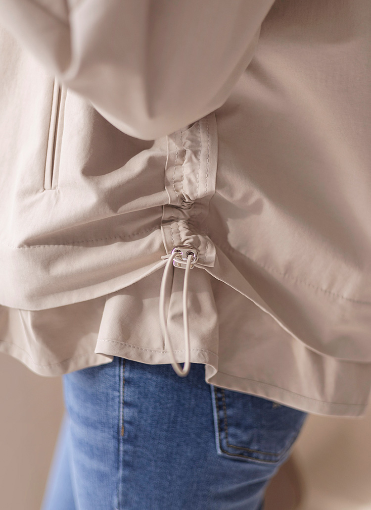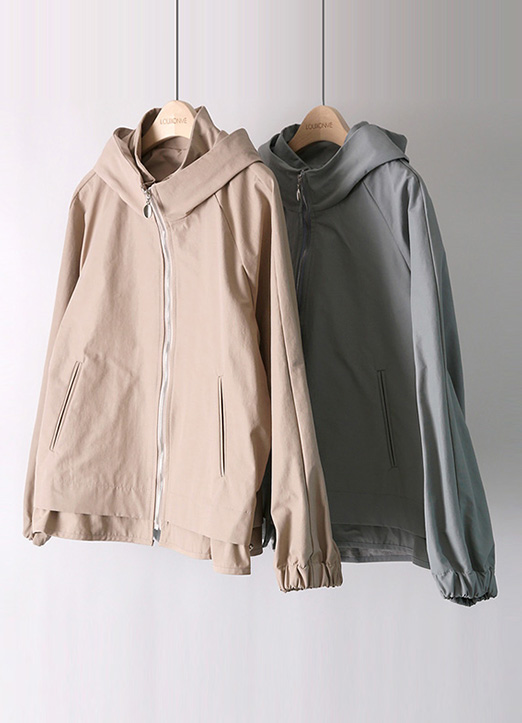 [A natural raglan fit with side string shirring for added volume, creating a stylish and casual hood zip-up jacket.]