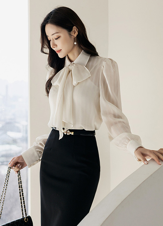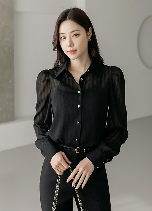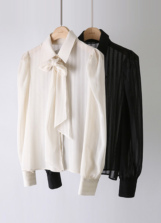 [LouisAngel] Sheer Striped Puff Sleeve Shirt w/ Scarf