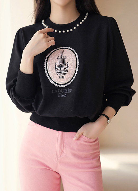 Lettering Pearl Embellished Back Slit Sweatshirt