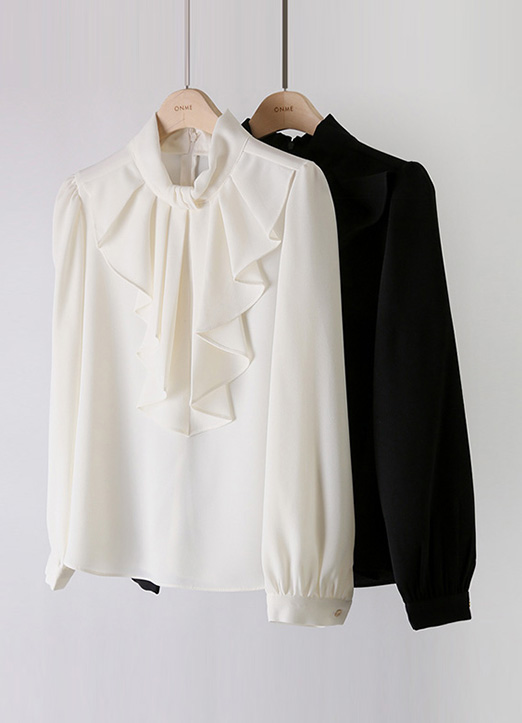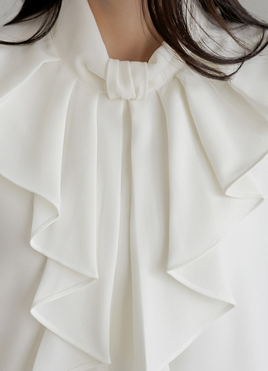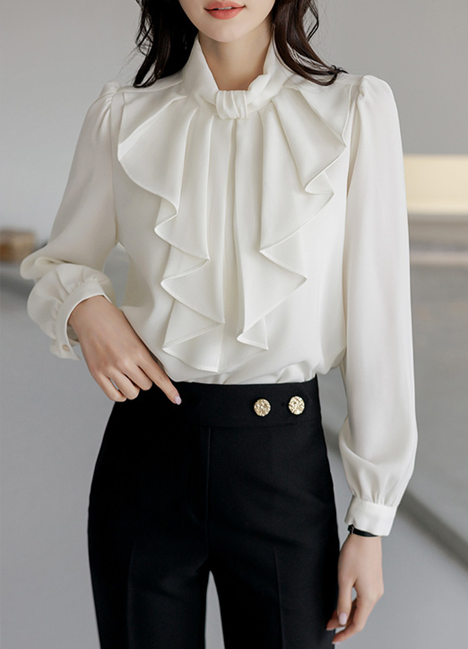 [A soft, silky blouse with a tie-up high neck and cascading ruffles, creating a feminine, voluminous silhouette with graceful flow.]