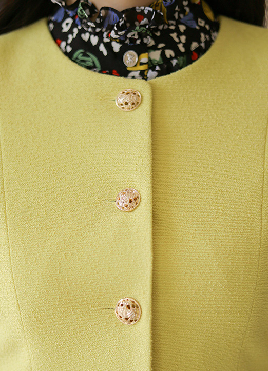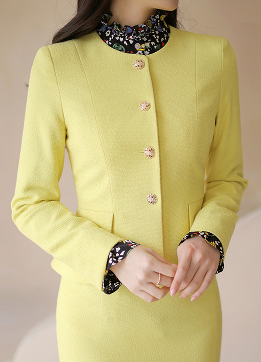 [Clean collarless neckline and contoured paneling enhance body proportions, while statement buttons add bright elegance to modern career fashion ensembles.]