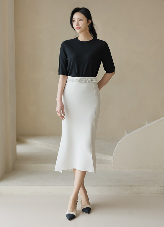 [The Onme] Unbalanced Side Long Slit Stretch Pull-On Skirt
