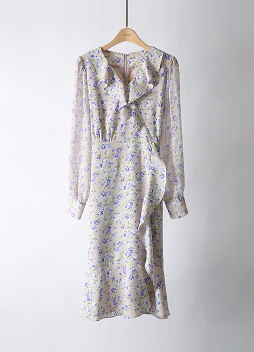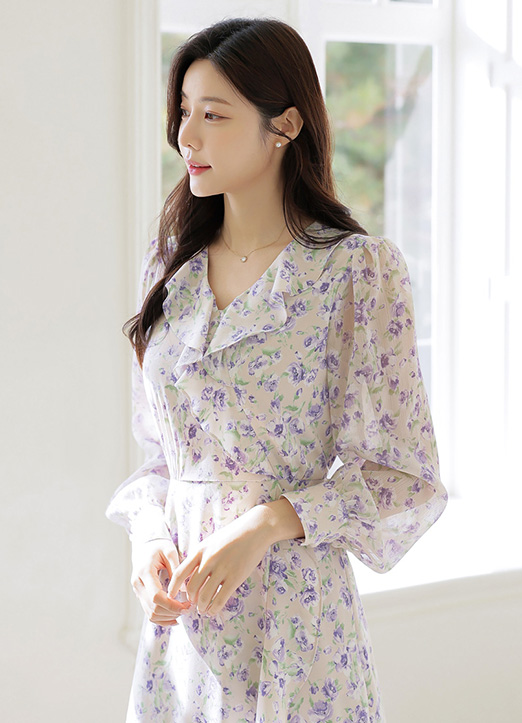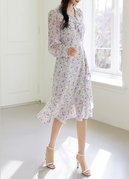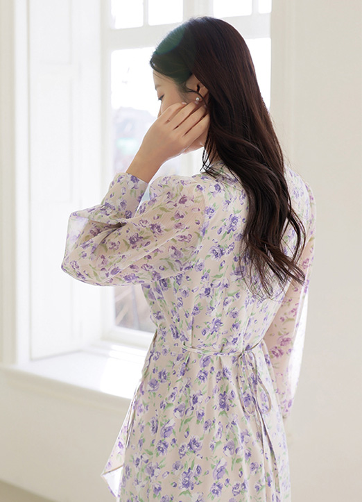 [LouisAngel] Violet Flower Allover Tie Waist Ruffle Chiffon Flare Dress