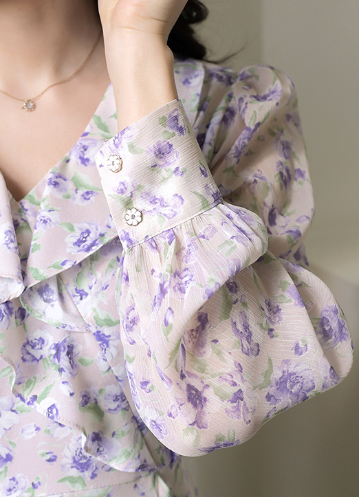 살랑살랑~ 하늘거리는 쉬폰 소재가 소매와 러플단에 배색되어있고