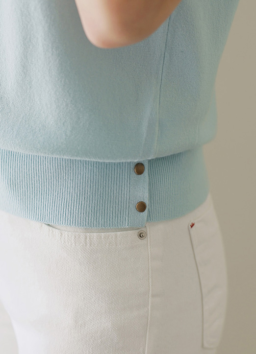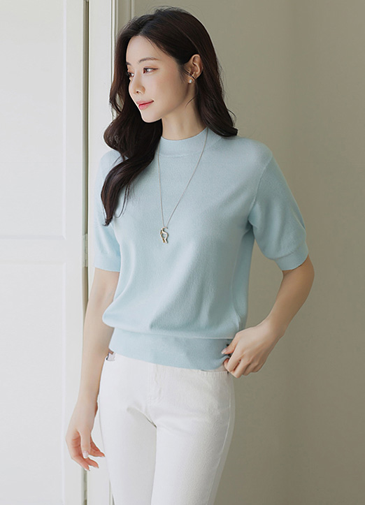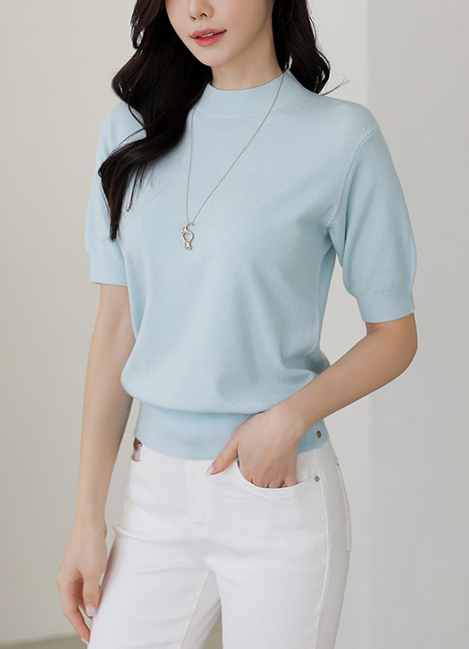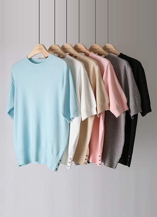 (6 Colors) Simple Ribbed Edge Button-Hem Half Sleeve Knit Top