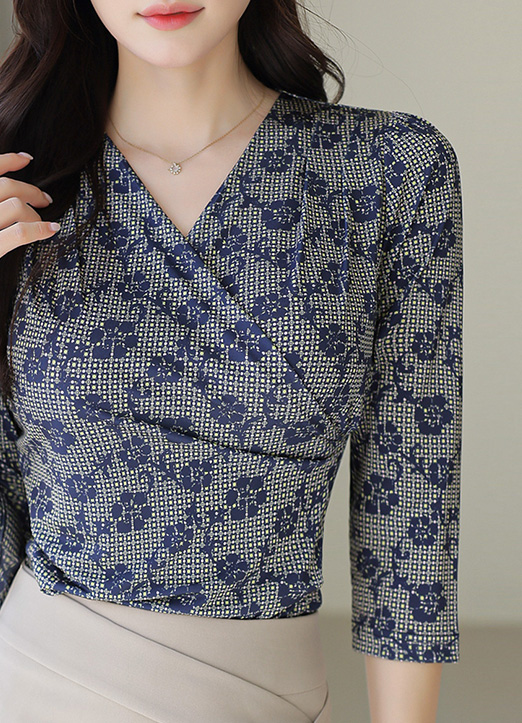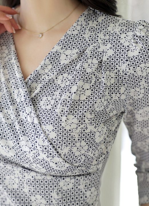 [LouisAngel] Flower Print Side Shirring Stretch Wrap Top