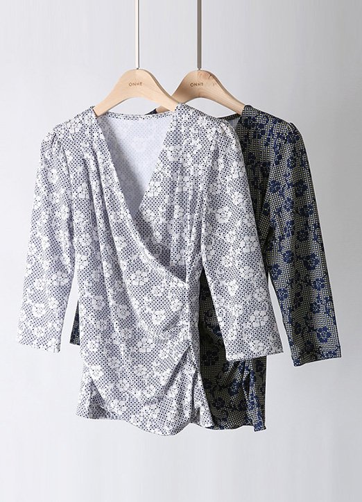 봄,가을 간절기 내내 간결하고 쾌적한 착용감으로 즐기실 수 있는 셔링 랩 블라우스 티에요