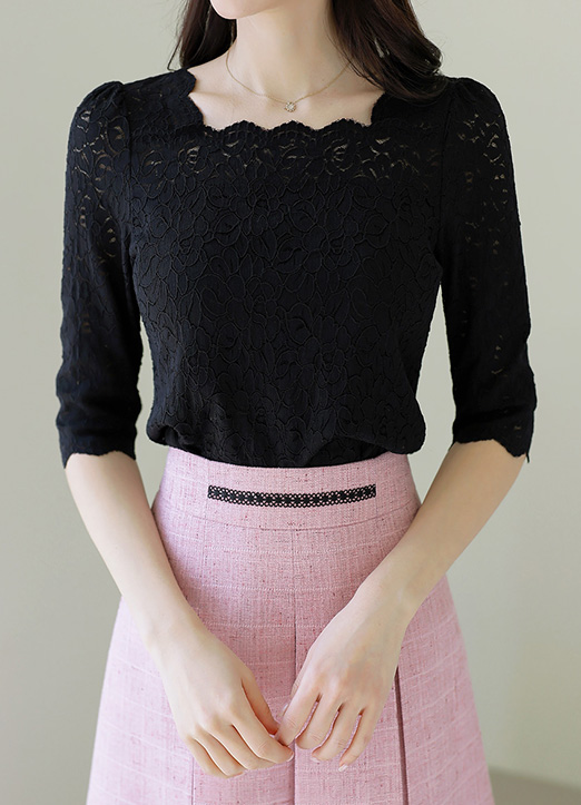 [Sophisticated lined lace blouse with delicate scalloped edges and three-quarter sleeves. Stretchy nylon blend creates a flattering slim fit with feminine appeal.]