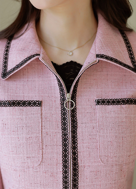 [A timeless pink tweed design with contrast lace detailing, ideal for styling over dresses or casual separates.]