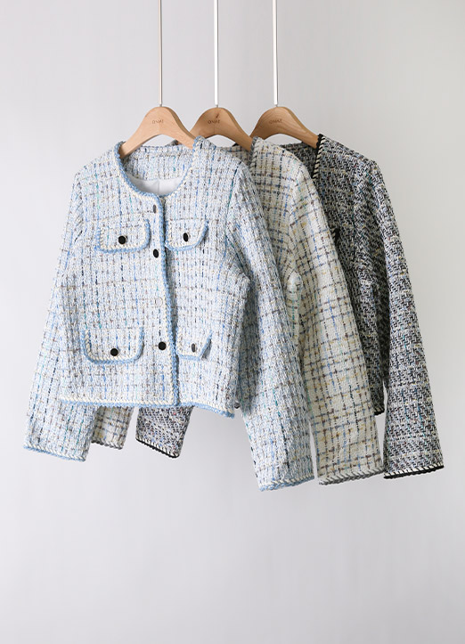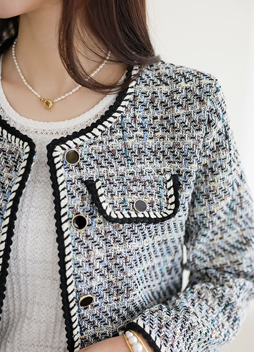 고급스러운 무드의 트위드 소재에 볼드한 블랙 버튼으로