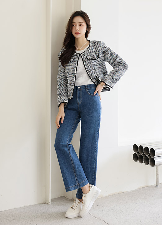 [The Onme] Braided Trim 4-Flap Collarless Tweed Jacket