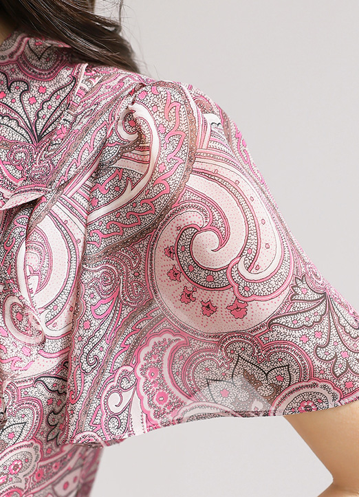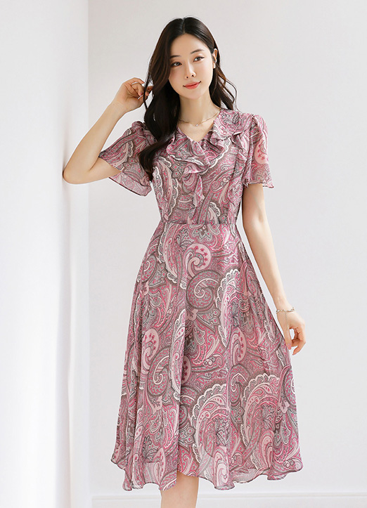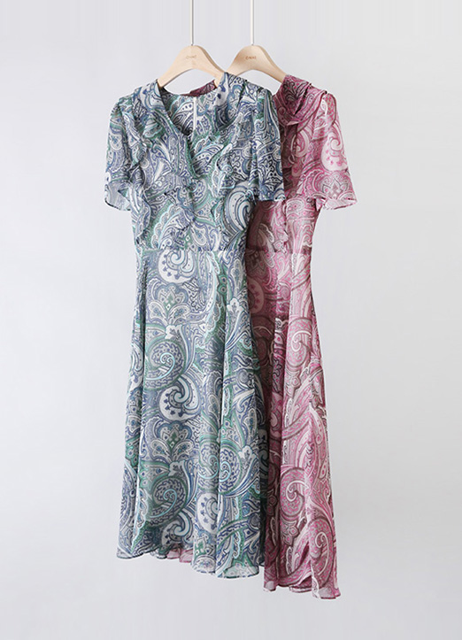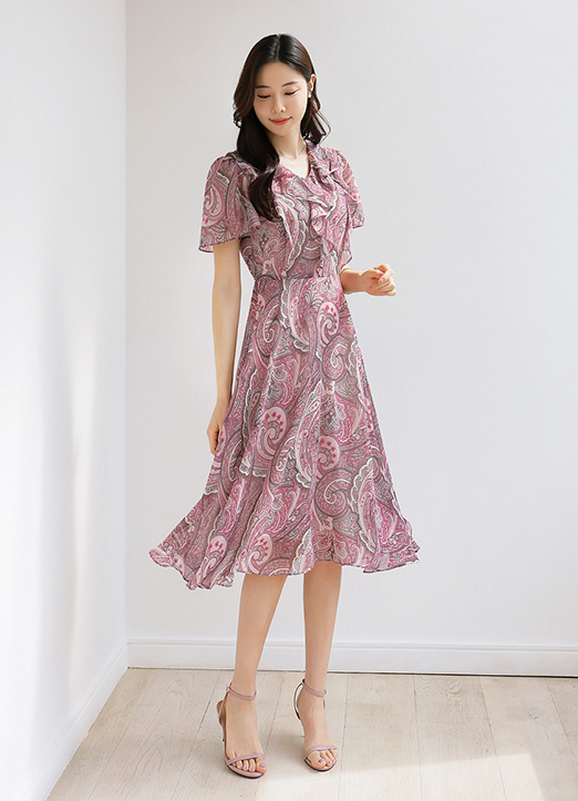 [Sophisticated paisley-print chiffon with gentle ruffle cascading from neckline. Strategic high waist and ribbon detail create a flattering, feminine silhouette.]