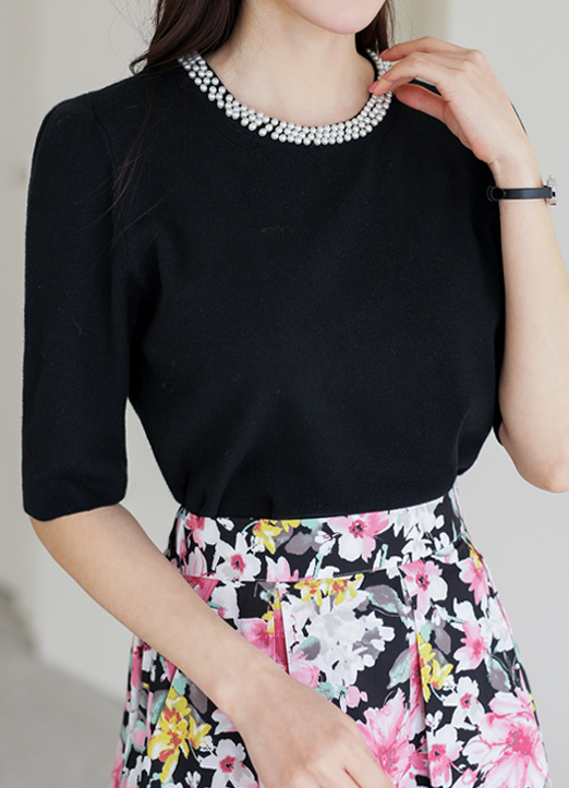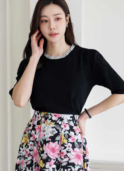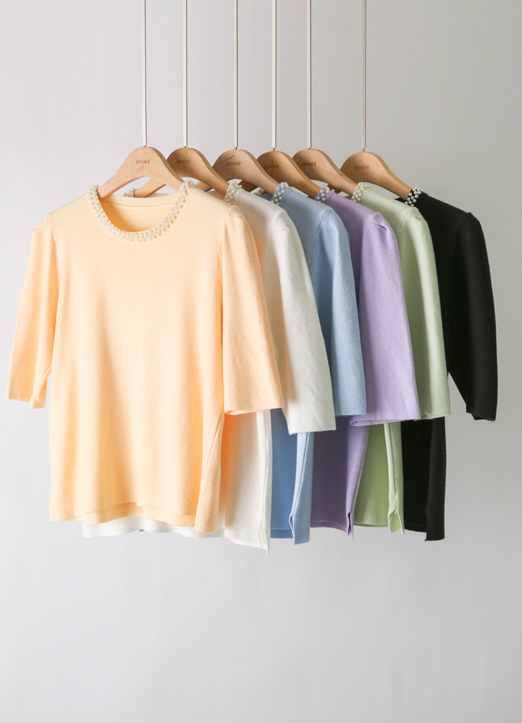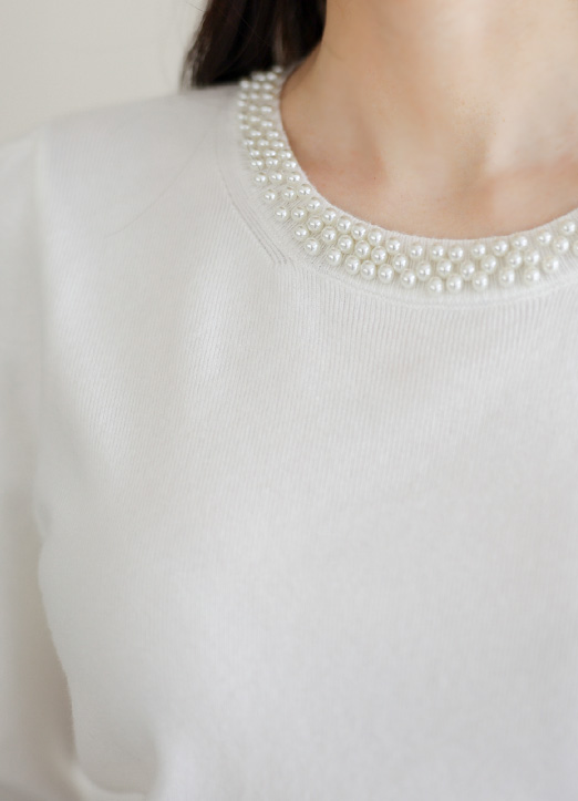 넥라인 진주 포인트로 고급스러움 묻어나는 니트입니다.