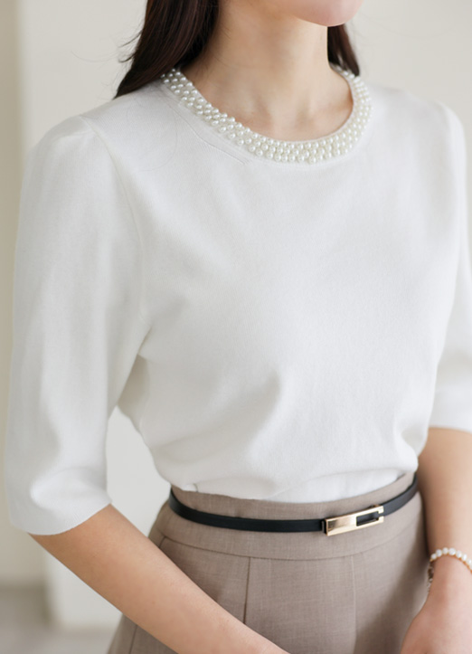 [ The Onme ] (6 Colors) Pearl Neckline Half Puff Sleeve Knit Top