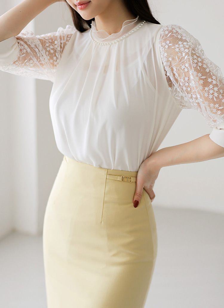 Pearl Embellished Neck Embroidered Flower Lace Sleeve Blouse