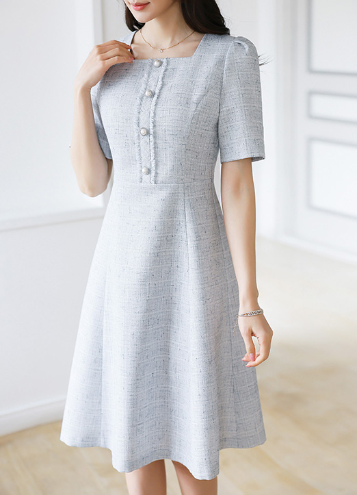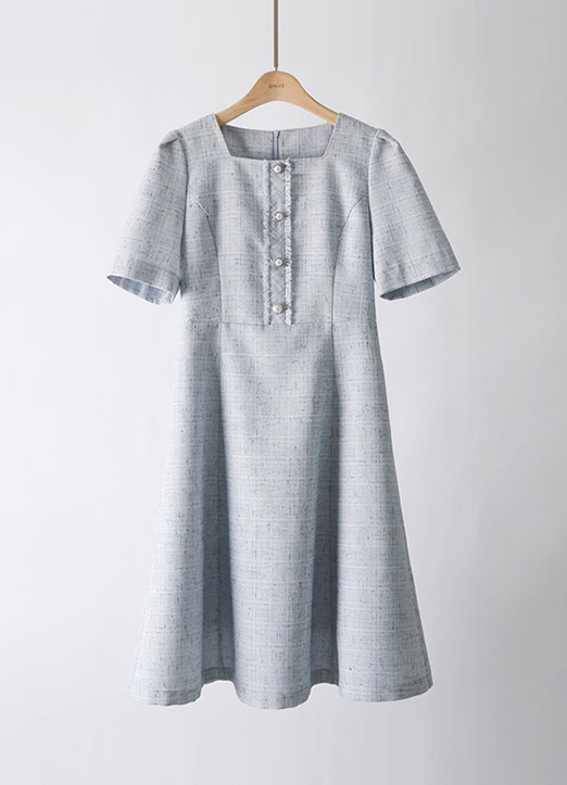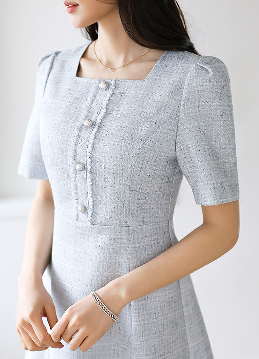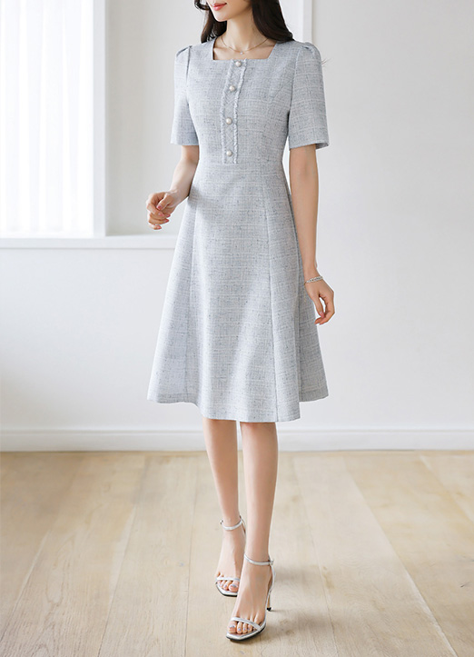 [LouisAngel] Square Neck Pearl Button Front Tweed Flare Dress