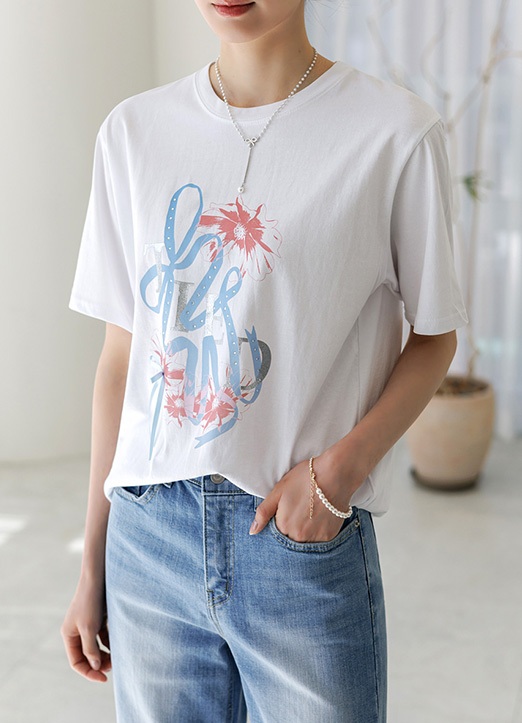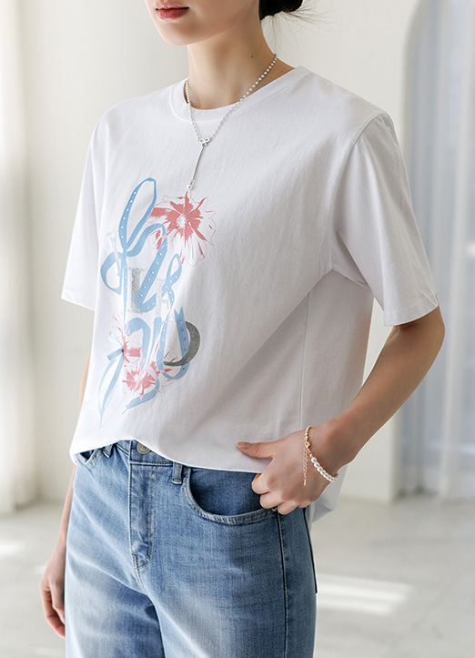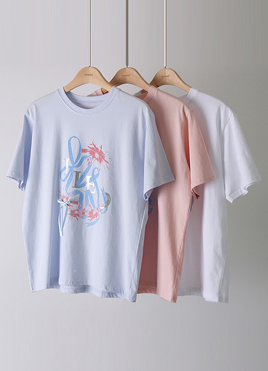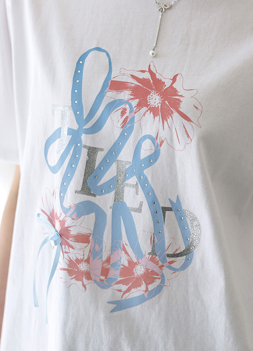 핫픽스와 리본이 더해져 시원하고 러블리한 무드가 느껴지는 티셔츠