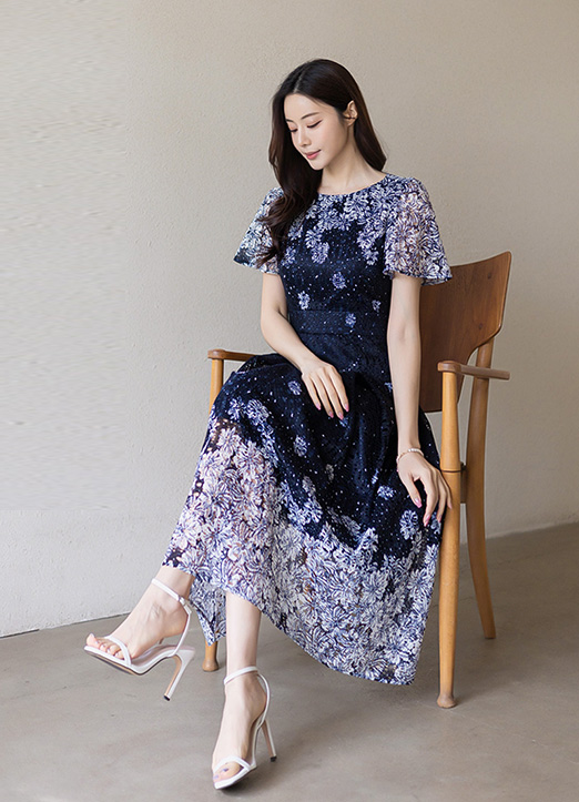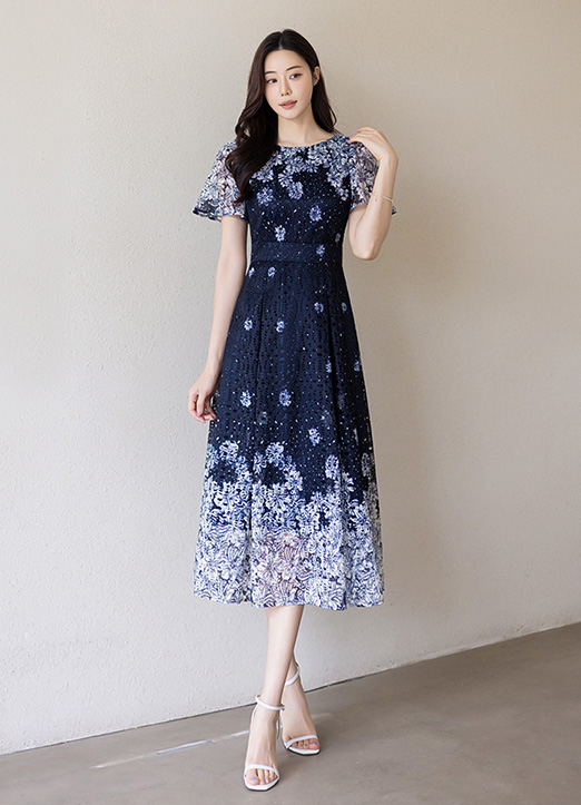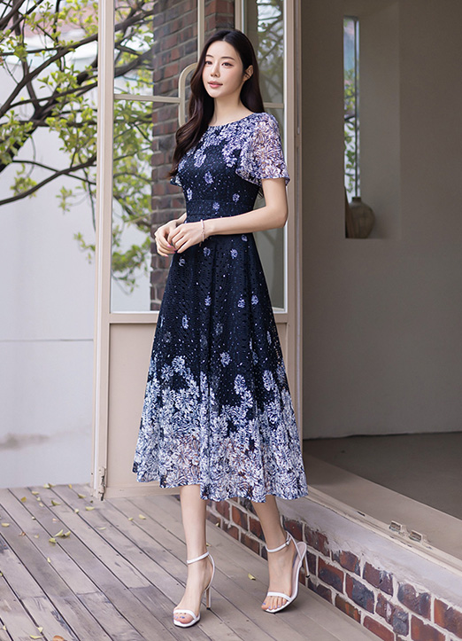 [LouisAngel] Two-Tone Floral Eyelet Lace Flare Dress