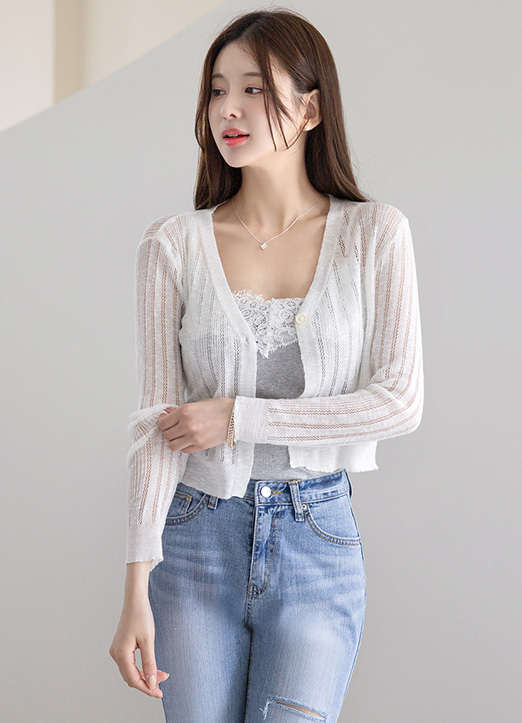 [Lightweight rayon blend with breathable open-knit texture offers cool comfort, while the cropped one-button bolero design adds an effortless layer for daily and vacation styling.]