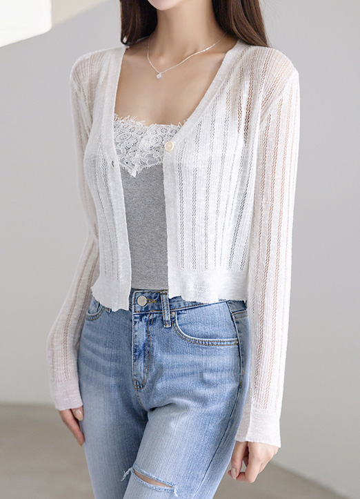 V-Neck Openwork Cropped Lightweight Knit Cardigan
