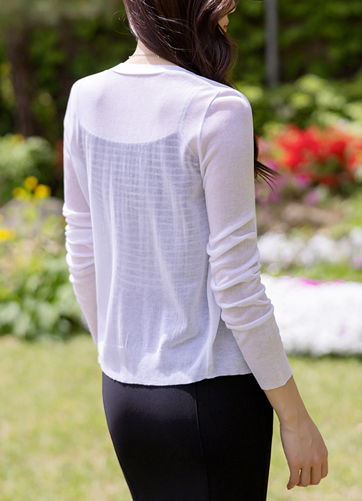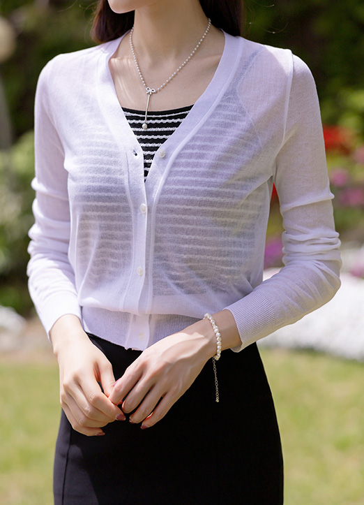 [Lightweight sheer knit, flattering slim silhouette, and versatile V-neck design create an effortlessly polished layering essential for chic spring to summer styling.]