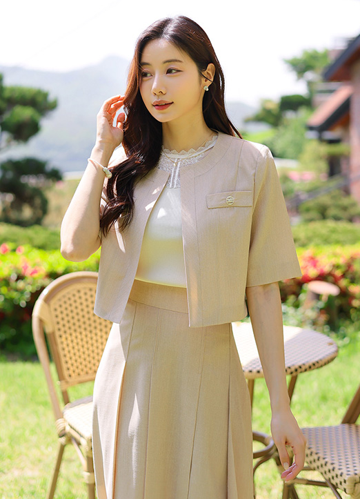 입체적인 텍스쳐로 깔끔하고 쾌적한 착용감을 주는 썸머 트위드 원단으로 제작되어