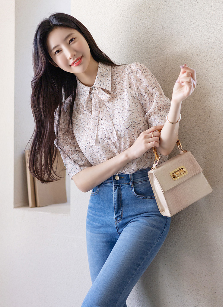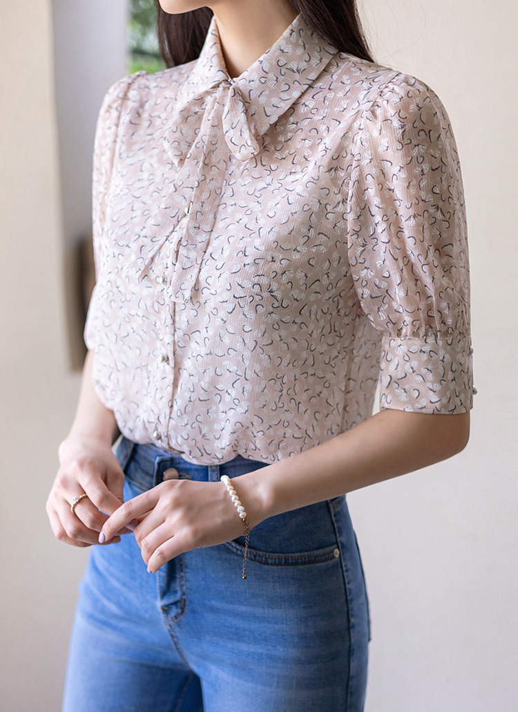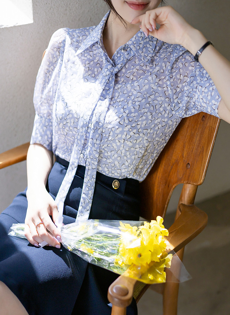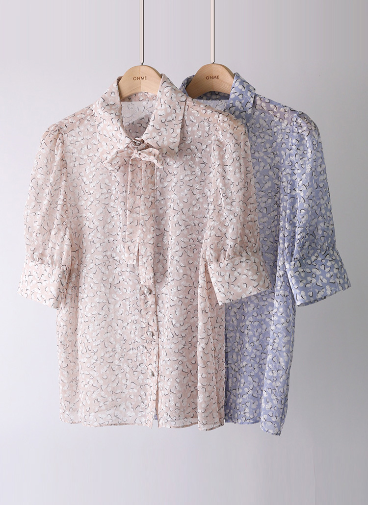 [LouisAngel] Allover Flower Crinkled Chiffon Blouse w/ Tie