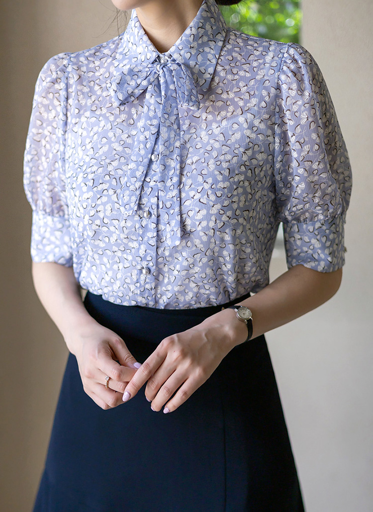 [Lightweight textured chiffon blouse scattered with dainty floral motifs. Flowing silhouette with flattering puff sleeves and removable tie for versatile styling.]