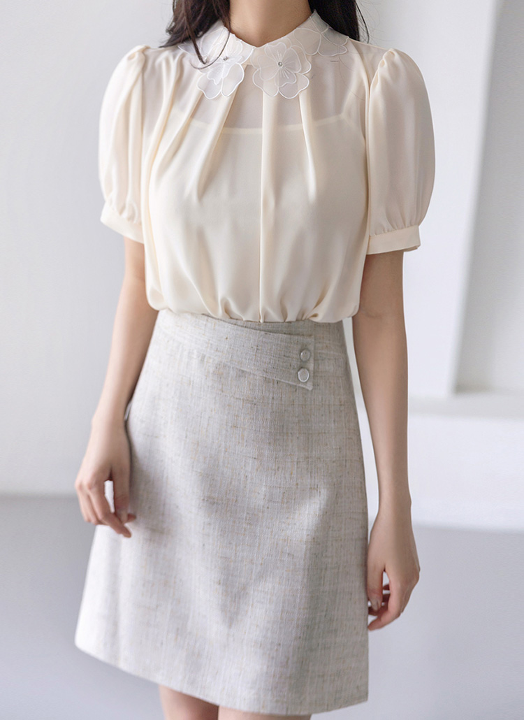 플라워 모티브 자수 카라와 핀턱 셔링 디테일로