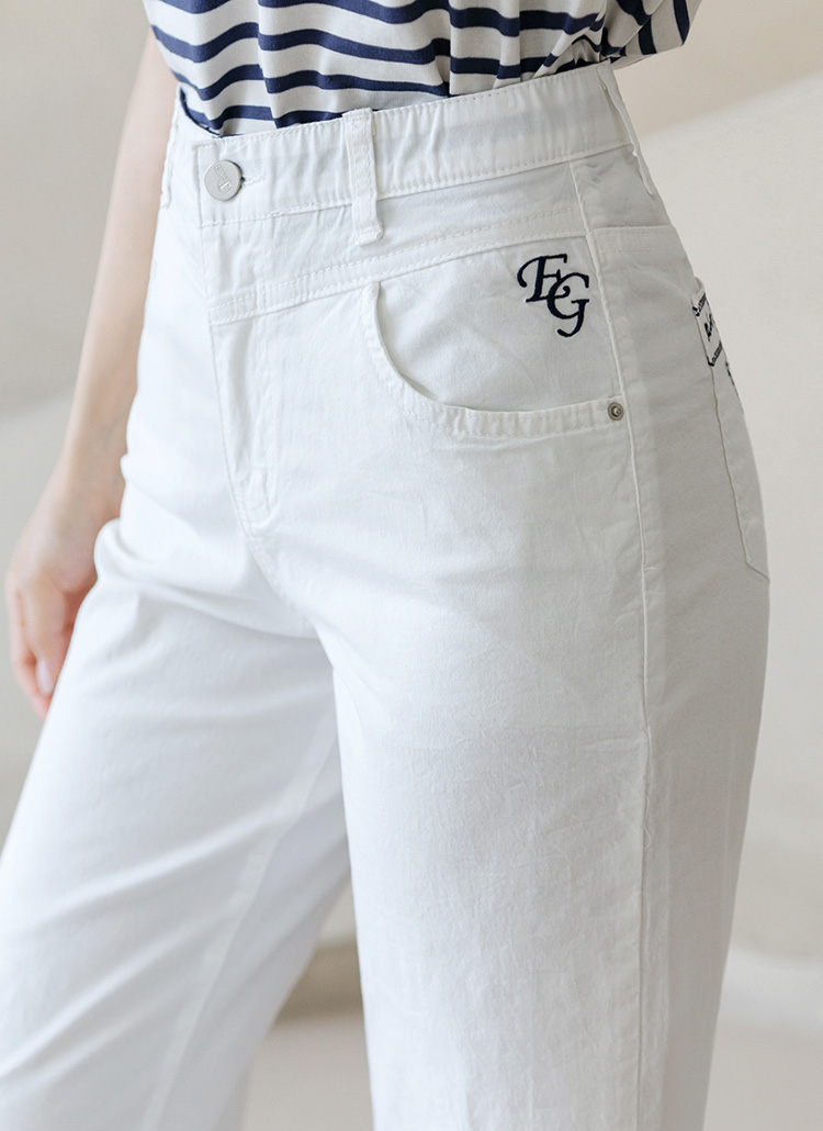 Elastic Waist Embroidered Lettering Wide Cotton Pants
