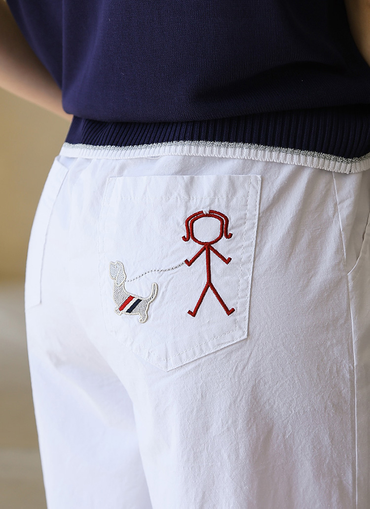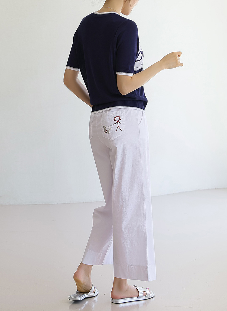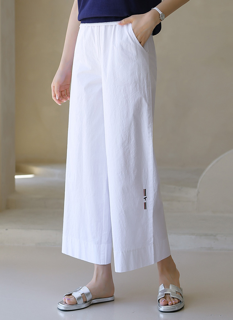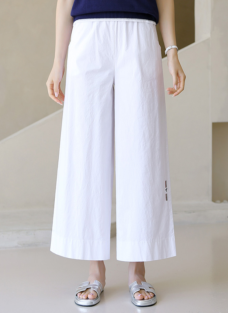 Elastic Waist Embroidered Detail Wide Leg Cotton Pants