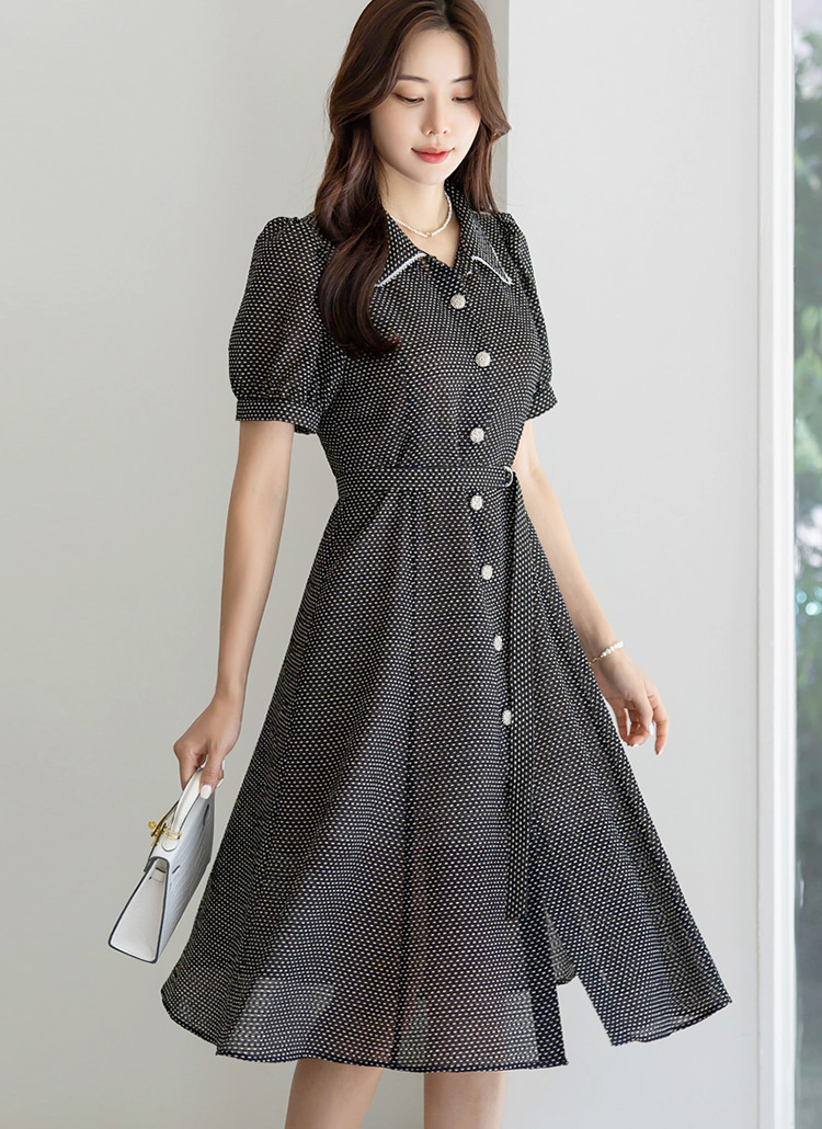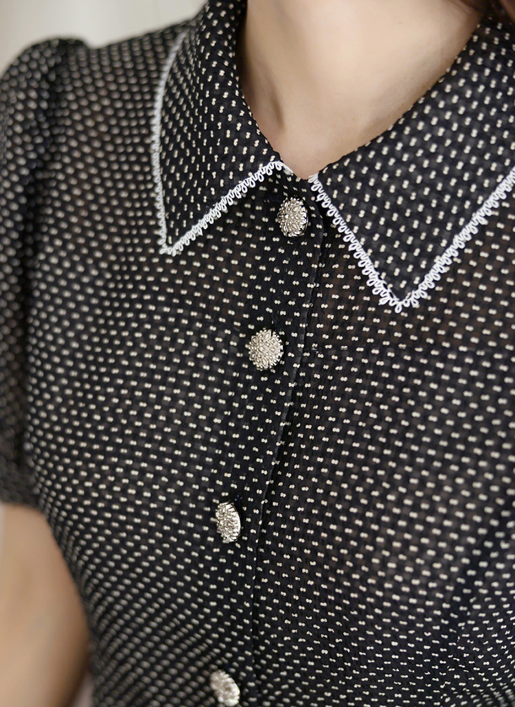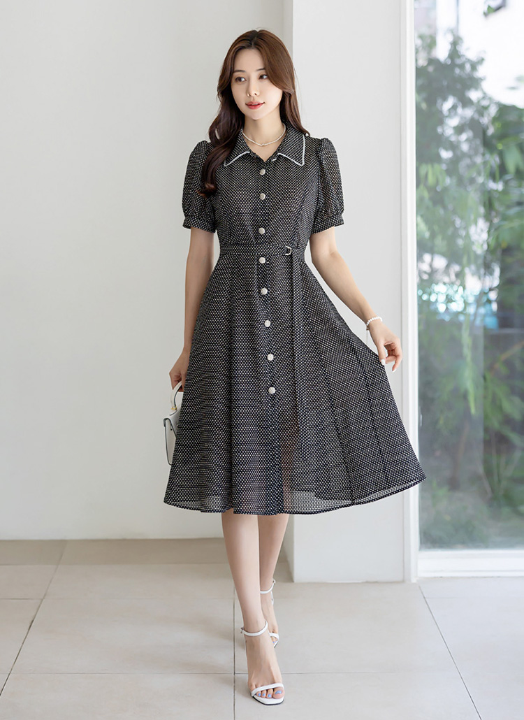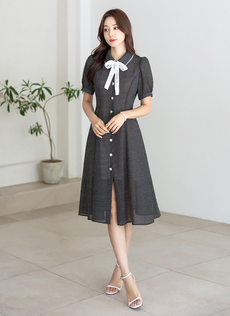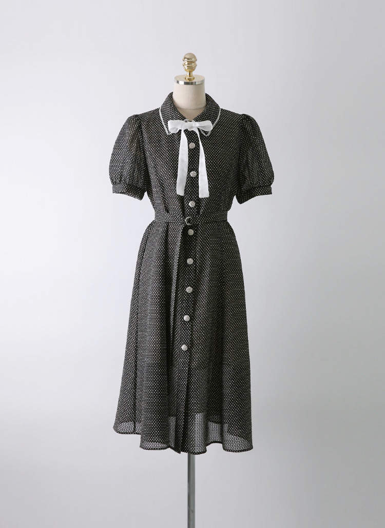 [LouisAngel] Motif Trim Collared Dot Print Seersucker Flare Dress w/ Belt & Tie