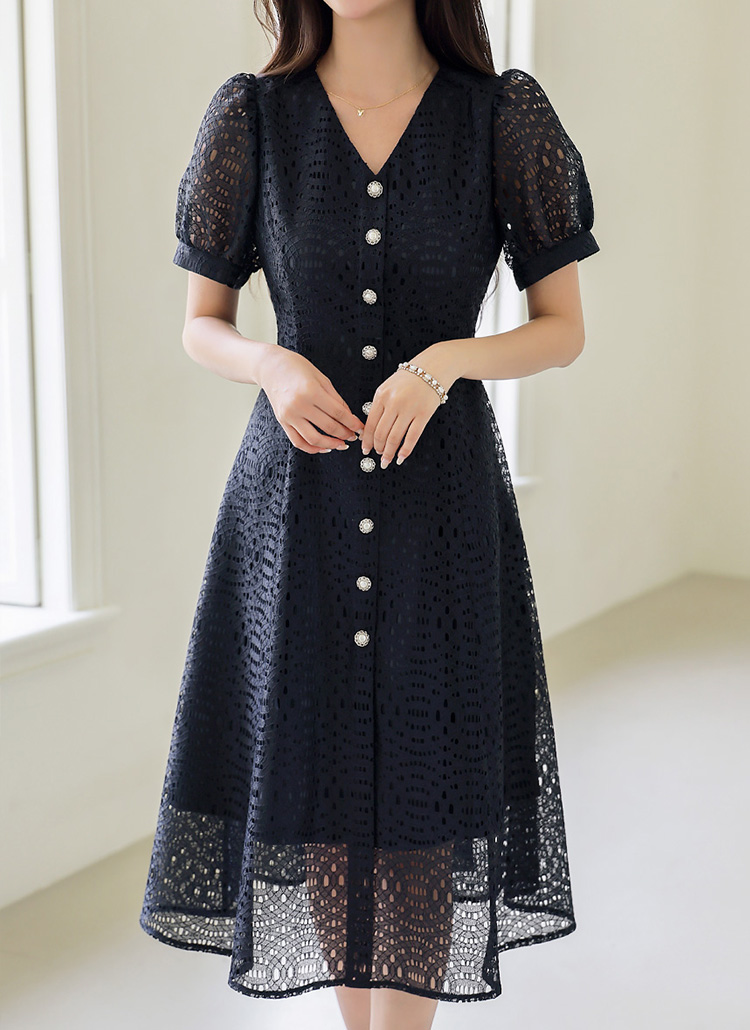 [LouisAngel] Jewel Button V-Neck Eyelet Lace Flare Dress