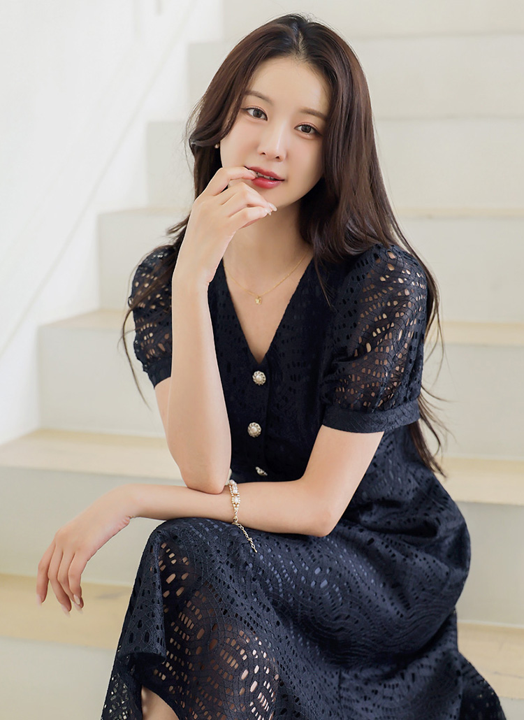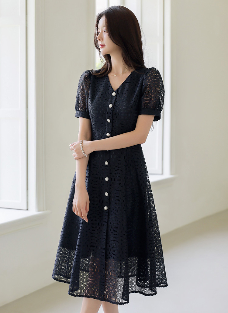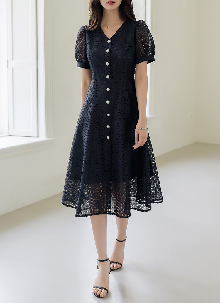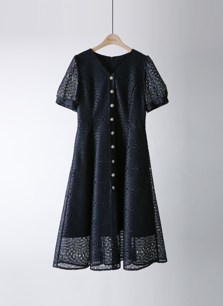 [LouisAngel] Jewel Button V-Neck Eyelet Lace Flare Dress
