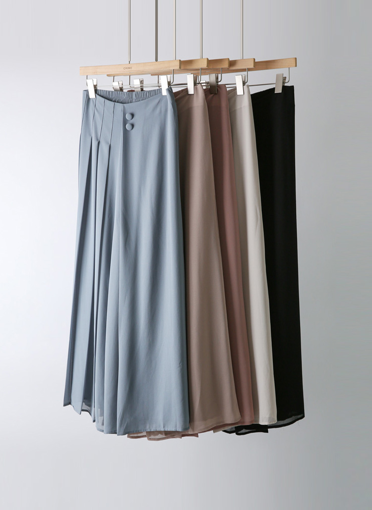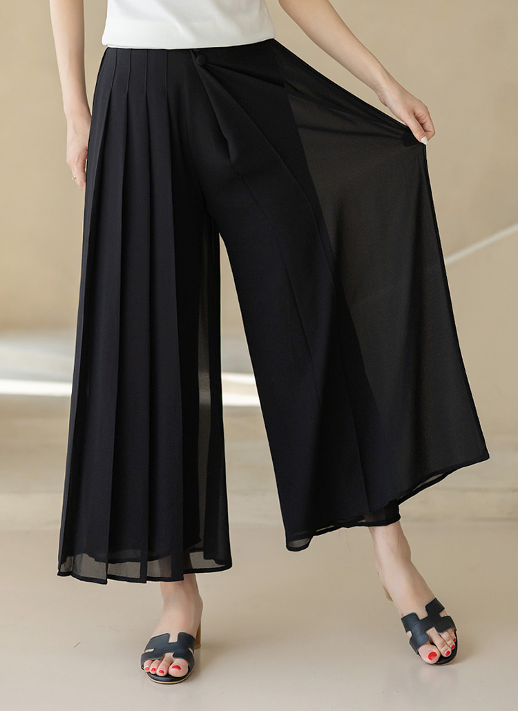 플리츠 디테일이 한쪽에만 가미된 랩 스타일의 와이드 치마바지로